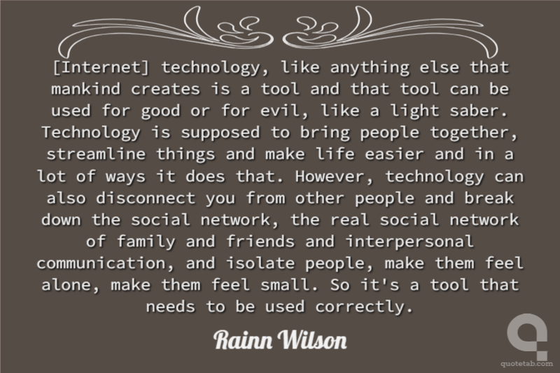 [Internet] technology, like anything else that mankind creates is a tool and that tool can be used for good or for evil, like a light saber. Technology is supposed to bring people together, streamline things and make life easier and in a lot of ways it does that. However, technology can also disconnect you from other people and break down the social network, the real social network of family and friends and interpersonal communication, and isolate people, make them feel alone, make them feel small. So it's a tool that needs to be used correctly.
