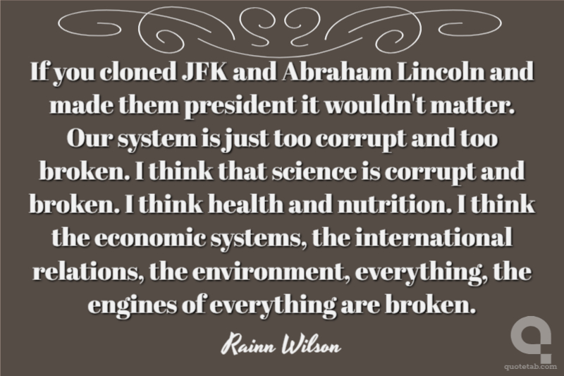 If you cloned JFK and Abraham Lincoln and made them president it wouldn't matter. Our system is just too corrupt and too broken. I think that science is corrupt and broken. I think health and nutrition. I think the economic systems, the international relations, the environment, everything, the engines of everything are broken.
