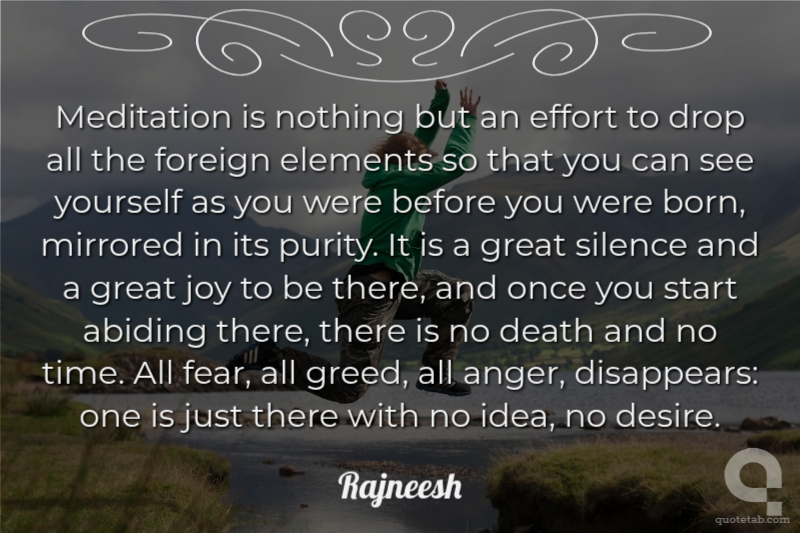 Meditation is nothing but an effort to drop all the foreign elements so that you can see yourself as you were before you were born, mirrored in its purity. It is a great silence and a great joy to be there, and once you start abiding there, there is no death and no time. All fear, all greed, all anger, disappears: one is just there with no idea, no desire.