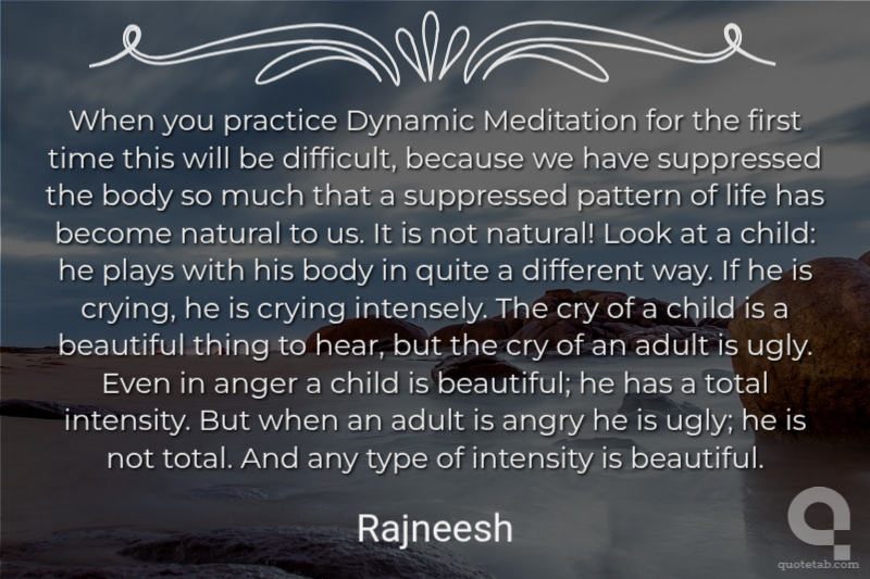 When you practice Dynamic Meditation for the first time this will be difficult, because we have suppressed the body so much that a suppressed pattern of life has become natural to us. It is not natural! Look at a child: he plays with his body in quite a different way. If he is crying, he is crying intensely. The cry of a child is a beautiful thing to hear, but the cry of an adult is ugly. Even in anger a child is beautiful; he has a total intensity. But when an adult is angry he is ugly; he is not total. And any type of intensity is beautiful.
