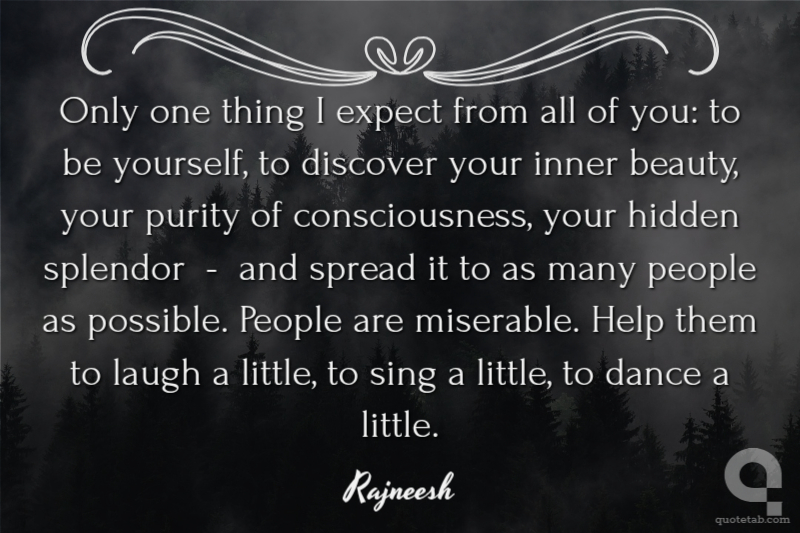 Only one thing I expect from all of you: to be yourself, to discover your inner beauty, your purity of consciousness, your hidden splendor - and spread it to as many people as possible. People are miserable. Help them to laugh a little, to sing a little, to dance a little.