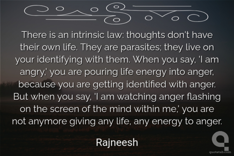There is an intrinsic law: thoughts don't have their own life. They are parasites; they live on your identifying with them. When you say, 'I am angry,' you are pouring life energy into anger, because you are getting identified with anger. But when you say, 'I am watching anger flashing on the screen of the mind within me,' you are not anymore giving any life, any energy to anger.