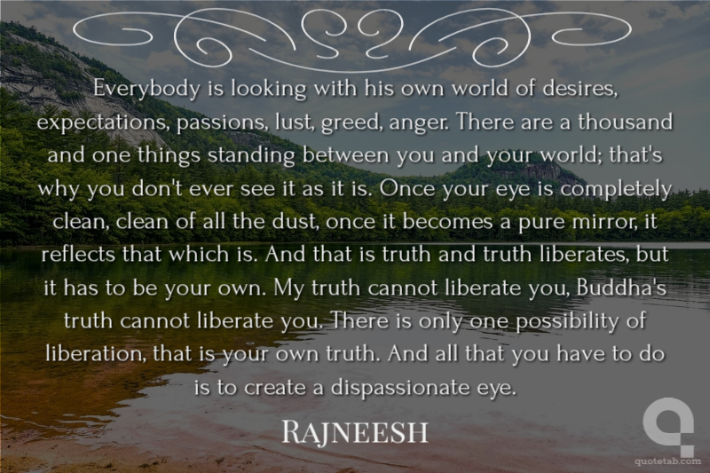 Everybody is looking with his own world of desires, expectations, passions, lust, greed, anger. There are a thousand and one things standing between you and your world; that's why you don't ever see it as it is. Once your eye is completely clean, clean of all the dust, once it becomes a pure mirror, it reflects that which is. And that is truth and truth liberates, but it has to be your own. My truth cannot liberate you, Buddha's truth cannot liberate you. There is only one possibility of liberation, that is your own truth. And all that you have to do is to create a dispassionate eye.