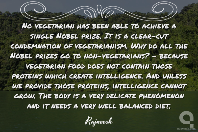 No vegetarian has been able to achieve a single Nobel prize. It is a clear-cut condemnation of vegetarianism. Why do all the Nobel prizes go to non-vegetarians? - because vegetarian food does not contain those proteins which create intelligence. And unless we provide those proteins, intelligence cannot grow. The body is a very delicate phenomenon and it needs a very well balanced diet.