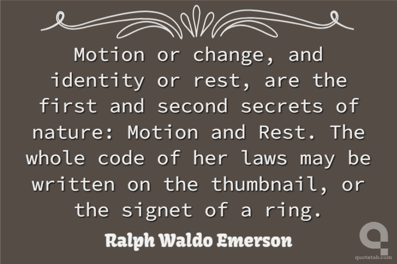 Motion or change, and identity or rest, are the first and second secrets of nature: Motion and Rest. The whole code of her laws may be written on the thumbnail, or the signet of a ring.