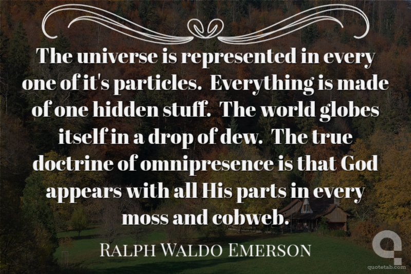 The universe is represented in every one of it's particles. Everything is made of one hidden stuff. The world globes itself in a drop of dew. The true doctrine of omnipresence is that God appears with all His parts in every moss and cobweb.