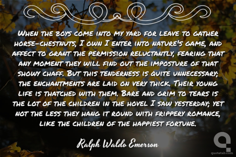 When the boys come into my yard for leave to gather horse-chestnuts, I own I enter into nature's game, and affect to grant the permission reluctantly, fearing that any moment they will find out the imposture of that showy chaff. But this tenderness is quite unnecessary; the enchantments are laid on very thick. Their young life is thatched with them. Bare and grim to tears is the lot of the children in the hovel I saw yesterday; yet not the less they hang it round with frippery romance, like the children of the happiest fortune.