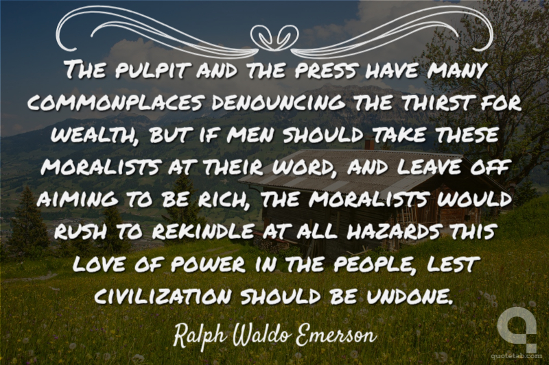 The pulpit and the press have many commonplaces denouncing the thirst for wealth, but if men should take these moralists at their word, and leave off aiming to be rich, the moralists would rush to rekindle at all hazards this love of power in the people, lest civilization should be undone.