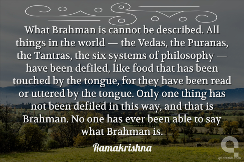 What Brahman is cannot be described. All things in the world — the Vedas, the Puranas, the Tantras, the six systems of philosophy — have been defiled, like food that has been touched by the tongue, for they have been read or uttered by the tongue. Only one thing has not been defiled in this way, and that is Brahman. No one has ever been able to say what Brahman is.