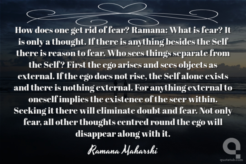 How does one get rid of fear? Ramana: What is fear? It is only a thought. If there is anything besides the Self there is reason to fear. Who sees things separate from the Self? First the ego arises and sees objects as external. If the ego does not rise, the Self alone exists and there is nothing external. For anything external to oneself implies the existence of the seer within. Seeking it there will eliminate doubt and fear. Not only fear, all other thoughts centred round the ego will disappear along with it.
