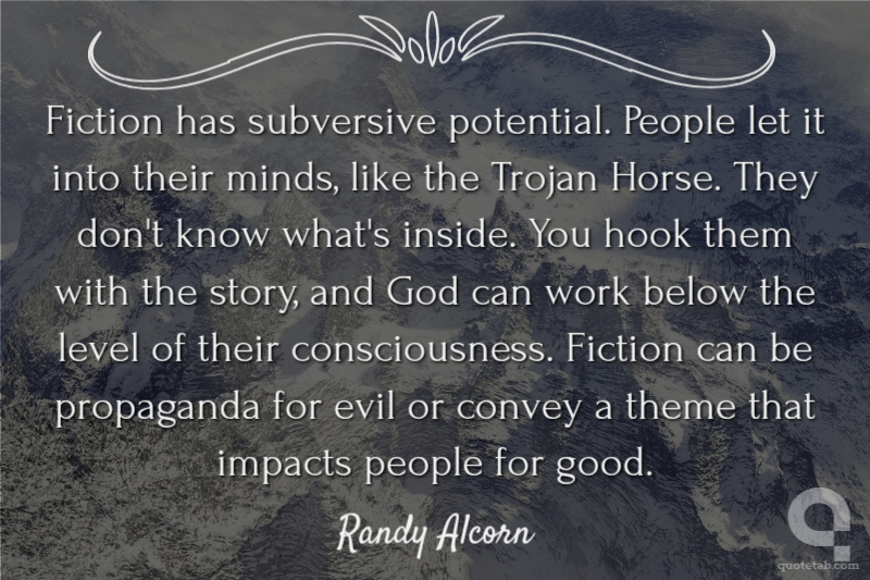 Fiction has subversive potential. People let it into their minds, like the Trojan Horse. They don't know what's inside. You hook them with the story, and God can work below the level of their consciousness. Fiction can be propaganda for evil or convey a theme that impacts people for good.