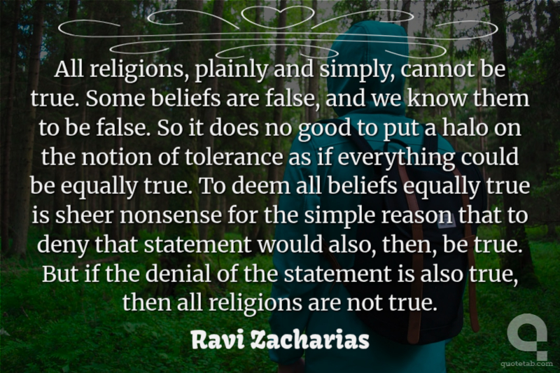 All religions, plainly and simply, cannot be true. Some beliefs are false, and we know them to be false. So it does no good to put a halo on the notion of tolerance as if everything could be equally true. To deem all beliefs equally true is sheer nonsense for the simple reason that to deny that statement would also, then, be true. But if the denial of the statement is also true, then all religions are not true.