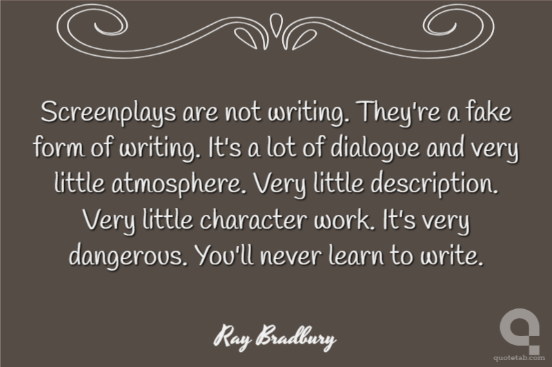 Screenplays are not writing. They're a fake form of writing. It's a lot of dialogue and very little atmosphere. Very little description. Very little character work. It's very dangerous. You'll never learn to write.