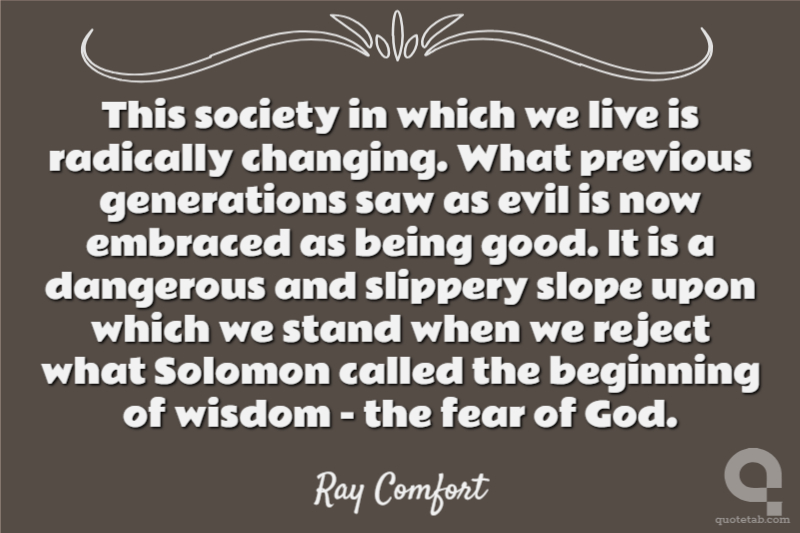 This society in which we live is radically changing. What previous generations saw as evil is now embraced as being good. It is a dangerous and slippery slope upon which we stand when we reject what Solomon called the beginning of wisdom - the fear of God.