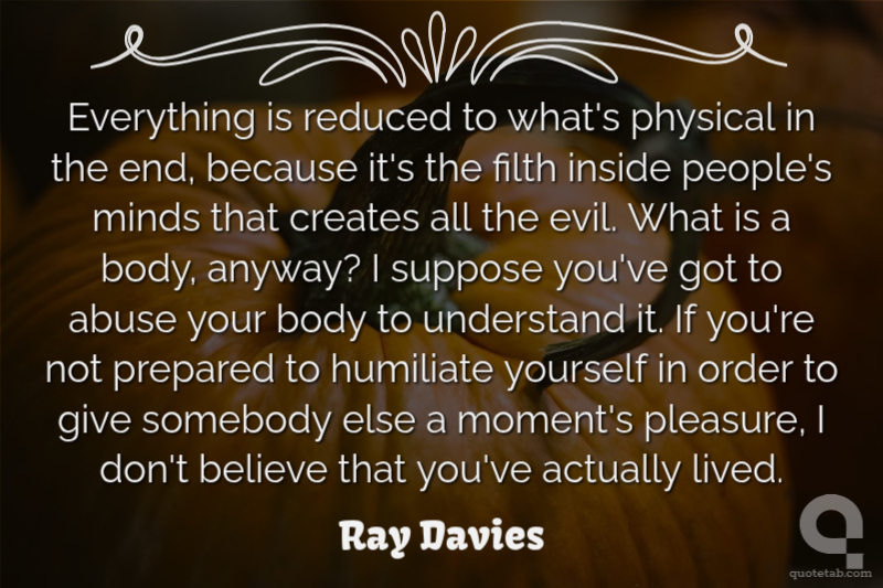 Everything is reduced to what's physical in the end, because it's the filth inside people's minds that creates all the evil. What is a body, anyway? I suppose you've got to abuse your body to understand it. If you're not prepared to humiliate yourself in order to give somebody else a moment's pleasure, I don't believe that you've actually lived.