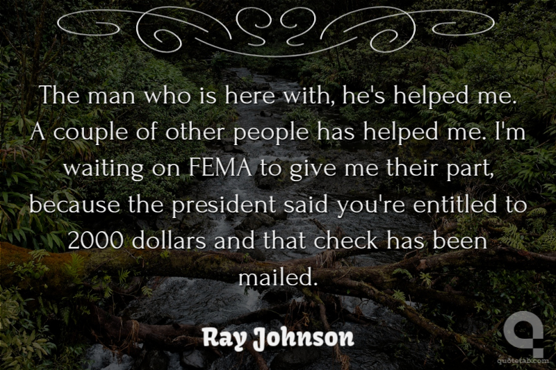 The man who is here with, he's helped me. A couple of other people has helped me. I'm waiting on FEMA to give me their part, because the president said you're entitled to 2000 dollars and that check has been mailed.