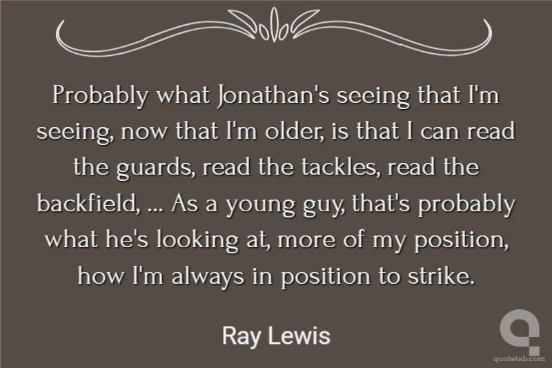 Probably what Jonathan's seeing that I'm seeing, now that I'm older, is that I can read the guards, read the tackles, read the backfield, ... As a young guy, that's probably what he's looking at, more of my position, how I'm always in position to strike.