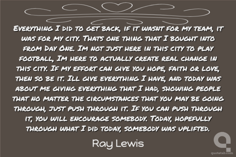 Everything I did to get back, if it wasnt for my team, it was for my city. Thats one thing that I bought into from Day One. Im not just here in this city to play football, Im here to actually create real change in this city. If my effort can give you hope, faith or love, then so be it. Ill give everything I have, and today was about me giving everything that I had, showing people that no matter the circumstances that you may be going through, just push through it. If you can push through it, you will encourage somebody. Today, hopefully through what I did today, somebody was uplifted.