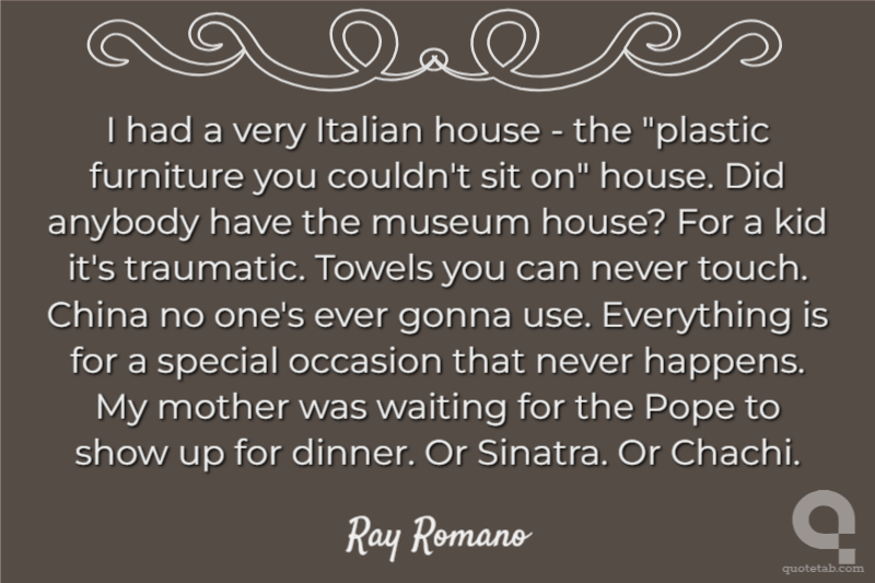 I had a very Italian house - the "plastic furniture you couldn't sit on" house. Did anybody have the museum house? For a kid it's traumatic. Towels you can never touch. China no one's ever gonna use. Everything is for a special occasion that never happens. My mother was waiting for the Pope to show up for dinner. Or Sinatra. Or Chachi.
