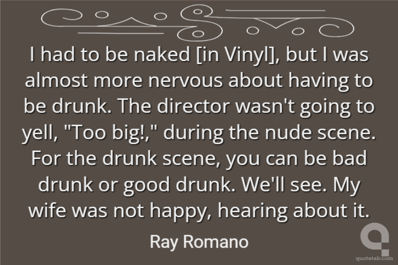 I had to be naked [in Vinyl], but I was almost more nervous about having to be drunk. The director wasn't going to yell, "Too big!," during the nude scene. For the drunk scene, you can be bad drunk or good drunk. We'll see. My wife was not happy, hearing about it.