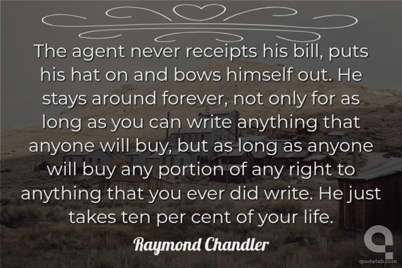 The agent never receipts his bill, puts his hat on and bows himself out. He stays around forever, not only for as long as you can write anything that anyone will buy, but as long as anyone will buy any portion of any right to anything that you ever did write. He just takes ten per cent of your life.