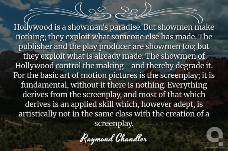 Hollywood is a showman's paradise. But showmen make nothing; they exploit what someone else has made. The publisher and the play producer are showmen too; but they exploit what is already made. The showmen of Hollywood control the making - and thereby degrade it. For the basic art of motion pictures is the screenplay; it is fundamental, without it there is nothing. Everything derives from the screenplay, and most of that which derives is an applied skill which, however adept, is artistically not in the same class with the creation of a screenplay.