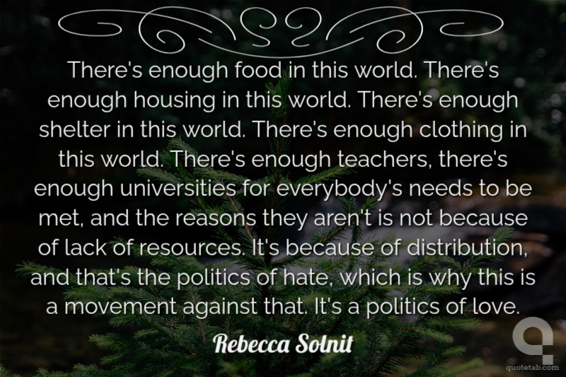 There's enough food in this world. There's enough housing in this world. There's enough shelter in this world. There's enough clothing in this world. There's enough teachers, there's enough universities for everybody's needs to be met, and the reasons they aren't is not because of lack of resources. It's because of distribution, and that's the politics of hate, which is why this is a movement against that. It's a politics of love.