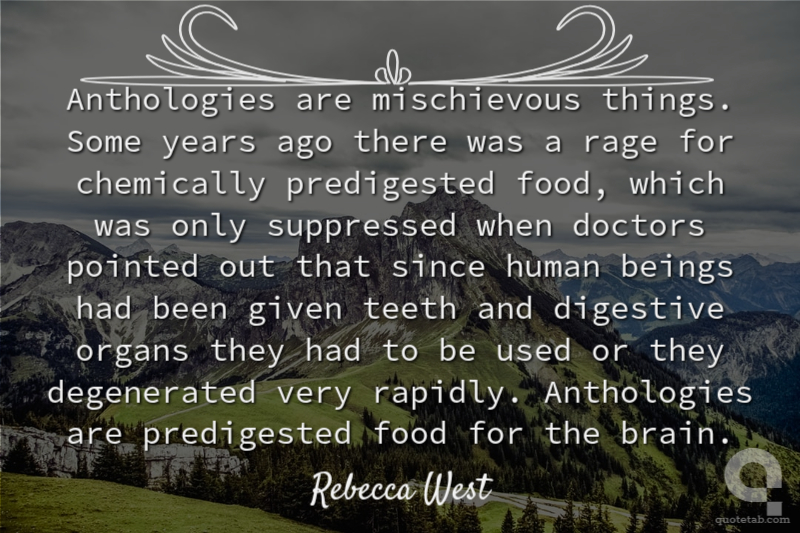 Anthologies are mischievous things. Some years ago there was a rage for chemically predigested food, which was only suppressed when doctors pointed out that since human beings had been given teeth and digestive organs they had to be used or they degenerated very rapidly. Anthologies are predigested food for the brain.