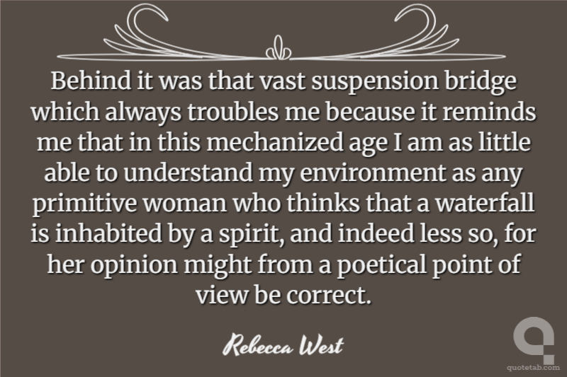 Behind it was that vast suspension bridge which always troubles me because it reminds me that in this mechanized age I am as little able to understand my environment as any primitive woman who thinks that a waterfall is inhabited by a spirit, and indeed less so, for her opinion might from a poetical point of view be correct.