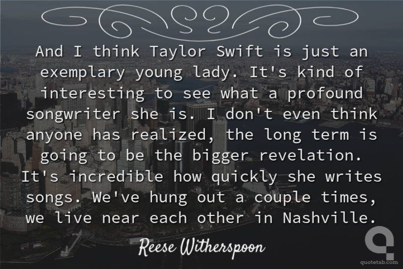 And I think Taylor Swift is just an exemplary young lady. It's kind of interesting to see what a profound songwriter she is. I don't even think anyone has realized, the long term is going to be the bigger revelation. It's incredible how quickly she writes songs. We've hung out a couple times, we live near each other in Nashville.