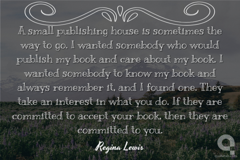 A small publishing house is sometimes the way to go. I wanted somebody who would publish my book and care about my book. I wanted somebody to know my book and always remember it, and I found one. They take an interest in what you do. If they are committed to accept your book, then they are committed to you.