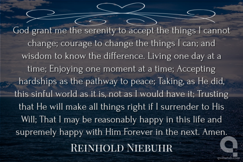 God grant me the serenity to accept the things I cannot change; courage to change the things I can; and wisdom to know the difference. Living one day at a time; Enjoying one moment at a time; Accepting hardships as the pathway to peace; Taking, as He did, this sinful world as it is, not as I would have it; Trusting that He will make all things right if I surrender to His Will; That I may be reasonably happy in this life and supremely happy with Him Forever in the next. Amen.
