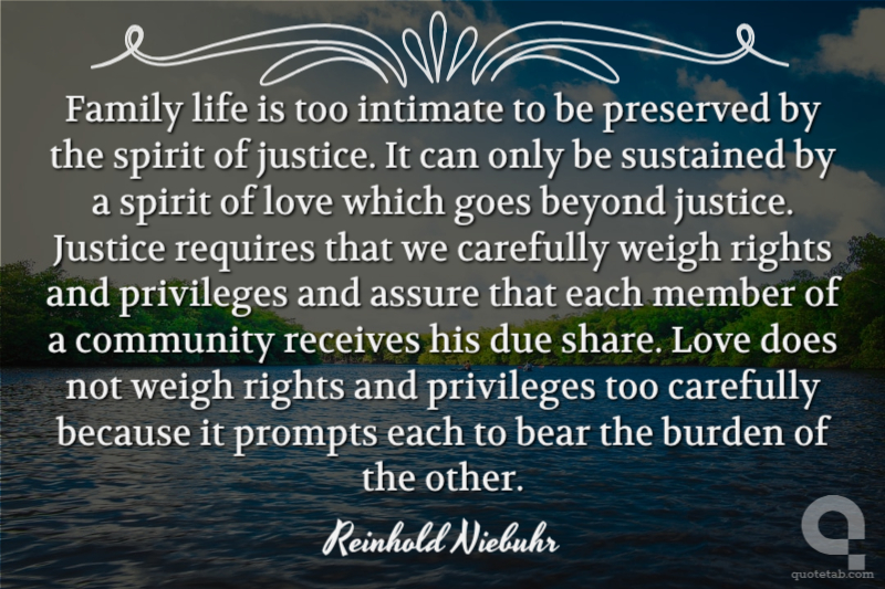 Family life is too intimate to be preserved by the spirit of justice. It can only be sustained by a spirit of love which goes beyond justice. Justice requires that we carefully weigh rights and privileges and assure that each member of a community receives his due share. Love does not weigh rights and privileges too carefully because it prompts each to bear the burden of the other.