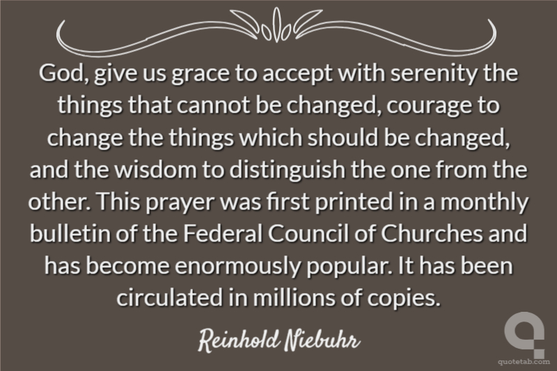 God, give us grace to accept with serenity the things that cannot be changed, courage to change the things which should be changed, and the wisdom to distinguish the one from the other. This prayer was first printed in a monthly bulletin of the Federal Council of Churches and has become enormously popular. It has been circulated in millions of copies.