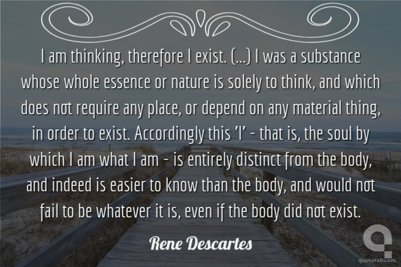 I am thinking, therefore I exist. (...) I was a substance whose whole essence or nature is solely to think, and which does not require any place, or depend on any material thing, in order to exist. Accordingly this 'I' - that is, the soul by which I am what I am - is entirely distinct from the body, and indeed is easier to know than the body, and would not fail to be whatever it is, even if the body did not exist.