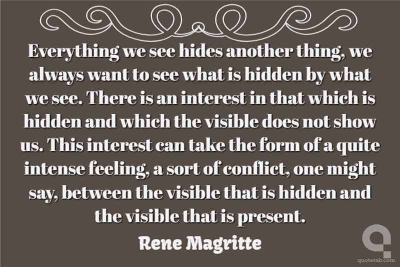Everything we see hides another thing, we always want to see what is hidden by what we see. There is an interest in that which is hidden and which the visible does not show us. This interest can take the form of a quite intense feeling, a sort of conflict, one might say, between the visible that is hidden and the visible that is present.