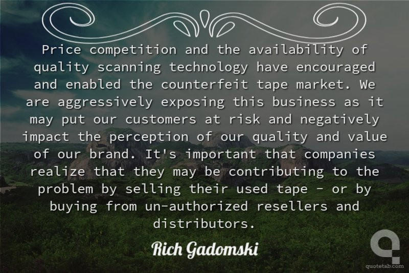 Price competition and the availability of quality scanning technology have encouraged and enabled the counterfeit tape market. We are aggressively exposing this business as it may put our customers at risk and negatively impact the perception of our quality and value of our brand. It's important that companies realize that they may be contributing to the problem by selling their used tape - or by buying from un-authorized resellers and distributors.