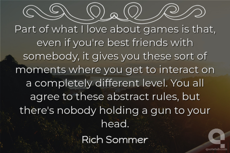 Part of what I love about games is that, even if you're best friends with somebody, it gives you these sort of moments where you get to interact on a completely different level. You all agree to these abstract rules, but there's nobody holding a gun to your head.