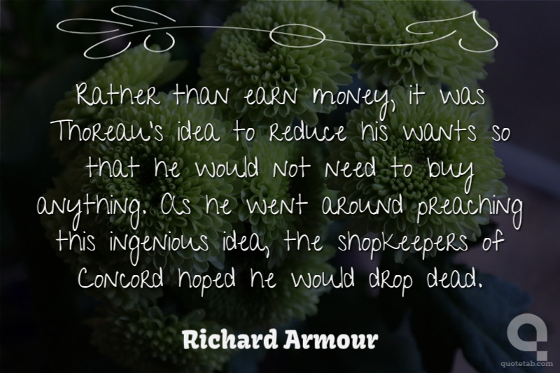 Rather than earn money, it was Thoreau's idea to reduce his wants so that he would not need to buy anything. As he went around preaching this ingenious idea, the shopkeepers of Concord hoped he would drop dead.
