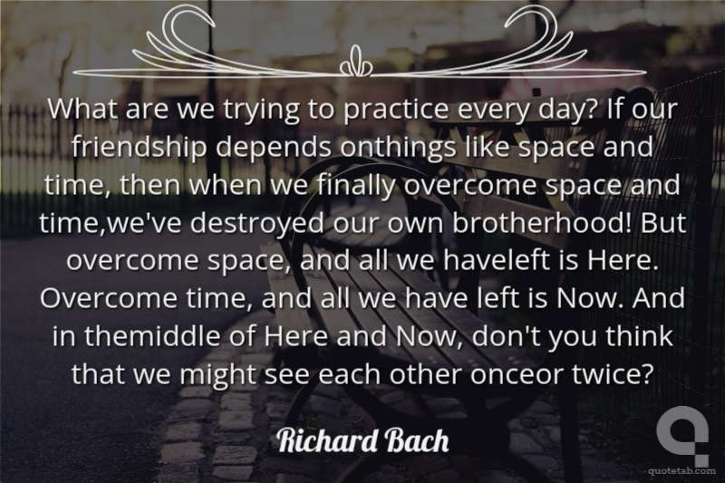 What are we trying to practice every day? If our friendship depends onthings like space and time, then when we finally overcome space and time,we've destroyed our own brotherhood! But overcome space, and all we haveleft is Here. Overcome time, and all we have left is Now. And in themiddle of Here and Now, don't you think that we might see each other onceor twice?