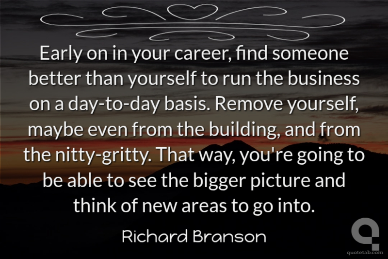 Early on in your career, find someone better than yourself to run the business on a day-to-day basis. Remove yourself, maybe even from the building, and from the nitty-gritty. That way, you're going to be able to see the bigger picture and think of new areas to go into.