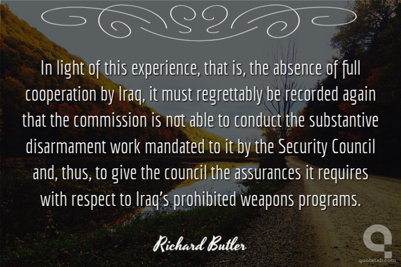 In light of this experience, that is, the absence of full cooperation by Iraq, it must regrettably be recorded again that the commission is not able to conduct the substantive disarmament work mandated to it by the Security Council and, thus, to give the council the assurances it requires with respect to Iraq's prohibited weapons programs.