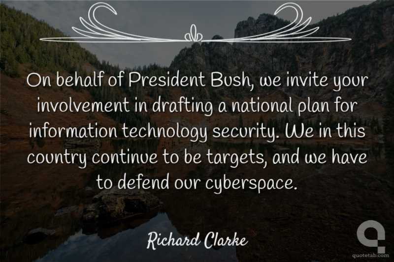 On behalf of President Bush, we invite your involvement in drafting a national plan for information technology security. We in this country continue to be targets, and we have to defend our cyberspace.