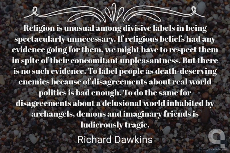 Religion is unusual among divisive labels in being spectacularly unnecessary. If religious beliefs had any evidence going for them, we might have to respect them in spite of their concomitant unpleasantness. But there is no such evidence. To label people as death-deserving enemies because of disagreements about real world politics is bad enough. To do the same for disagreements about a delusional world inhabited by archangels, demons and imaginary friends is ludicrously tragic.