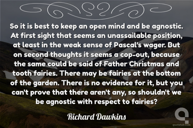 So it is best to keep an open mind and be agnostic. At first sight that seems an unassailable position, at least in the weak sense of Pascal's wager. But on second thoughts it seems a cop-out, because the same could be said of Father Christmas and tooth fairies. There may be fairies at the bottom of the garden. There is no evidence for it, but you can't prove that there aren't any, so shouldn't we be agnostic with respect to fairies?