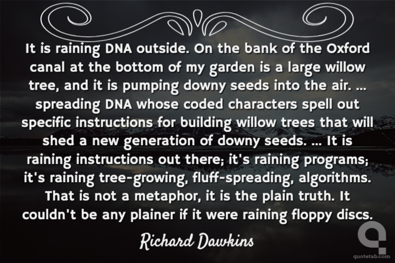 It is raining DNA outside. On the bank of the Oxford canal at the bottom of my garden is a large willow tree, and it is pumping downy seeds into the air. ... spreading DNA whose coded characters spell out specific instructions for building willow trees that will shed a new generation of downy seeds. ... It is raining instructions out there; it's raining programs; it's raining tree-growing, fluff-spreading, algorithms. That is not a metaphor, it is the plain truth. It couldn't be any plainer if it were raining floppy discs.