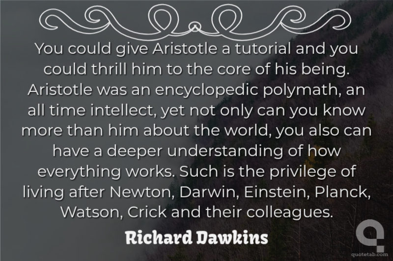 You could give Aristotle a tutorial and you could thrill him to the core of his being. Aristotle was an encyclopedic polymath, an all time intellect, yet not only can you know more than him about the world, you also can have a deeper understanding of how everything works. Such is the privilege of living after Newton, Darwin, Einstein, Planck, Watson, Crick and their colleagues.