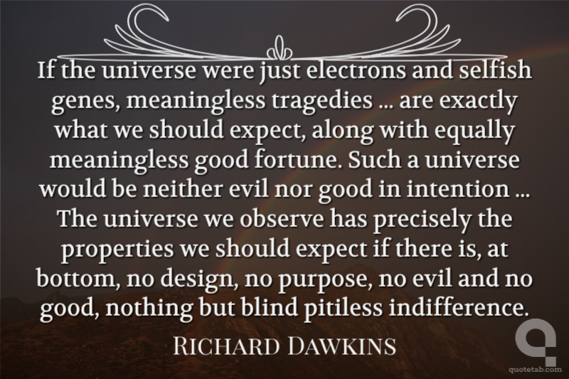If the universe were just electrons and selfish genes, meaningless tragedies ... are exactly what we should expect, along with equally meaningless good fortune. Such a universe would be neither evil nor good in intention ... The universe we observe has precisely the properties we should expect if there is, at bottom, no design, no purpose, no evil and no good, nothing but blind pitiless indifference.