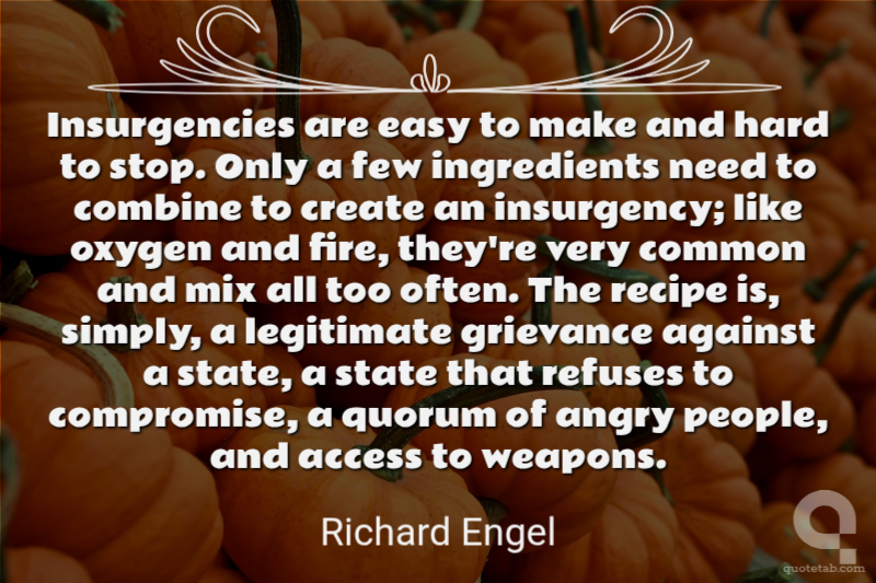 Insurgencies are easy to make and hard to stop. Only a few ingredients need to combine to create an insurgency; like oxygen and fire, they're very common and mix all too often. The recipe is, simply, a legitimate grievance against a state, a state that refuses to compromise, a quorum of angry people, and access to weapons.