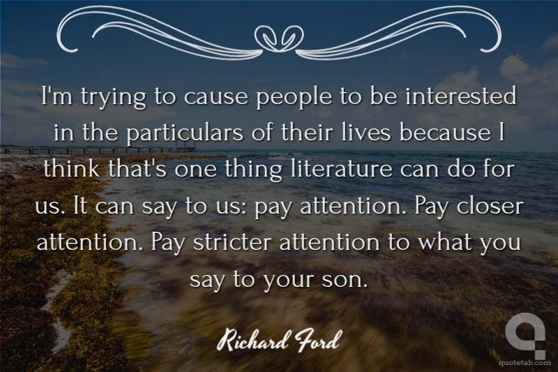 I'm trying to cause people to be interested in the particulars of their lives because I think that's one thing literature can do for us. It can say to us: pay attention. Pay closer attention. Pay stricter attention to what you say to your son.